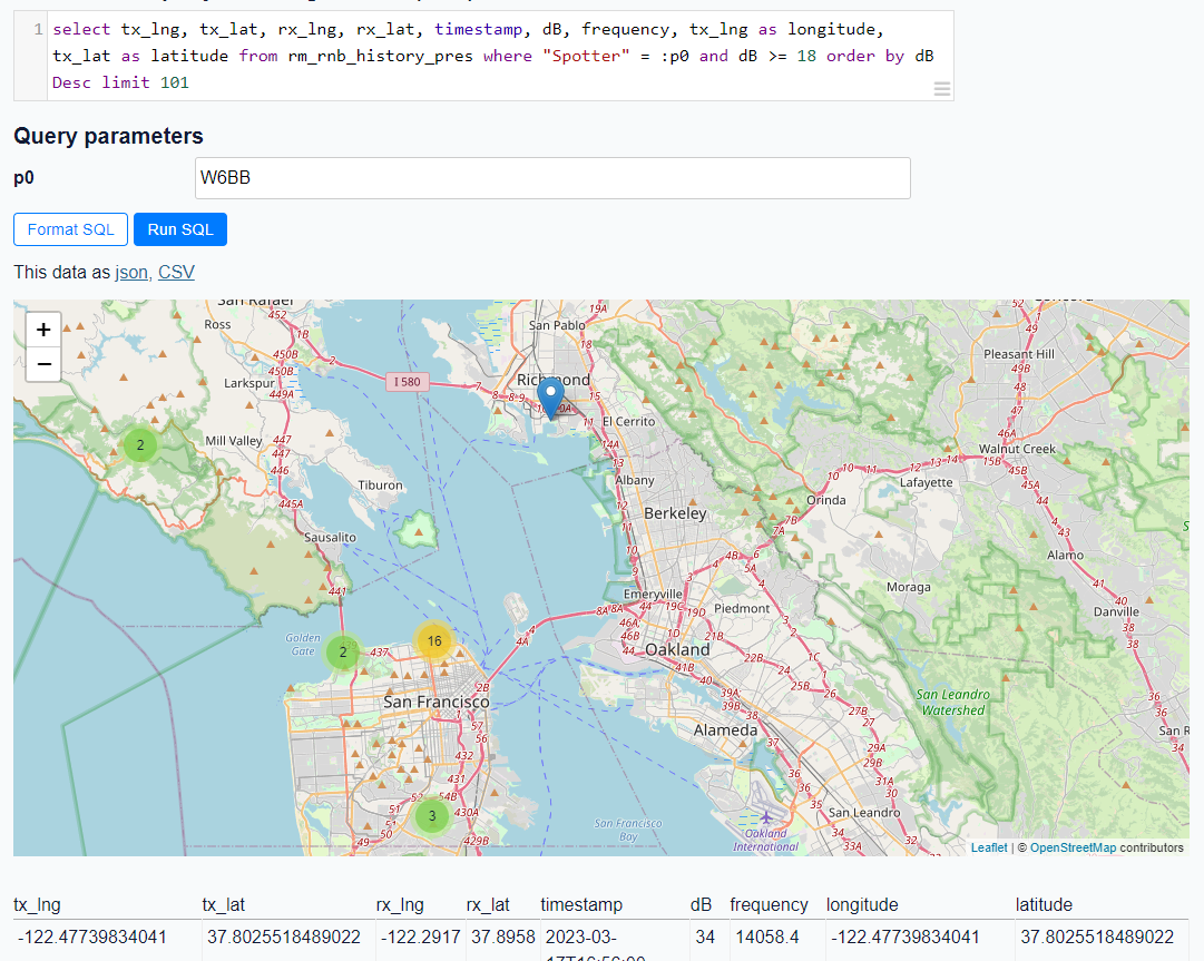 Then! I renamed columns in SQL to get a cluster map of locations where the Rockmite was spotted by W6BB—UC Berkeley's across the Bay ham shack—with an SNR greater than or equal to 18 dB, (the result I'd seen this morning while testing the amplifier..